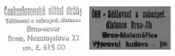 | 1946 | správní obvody dorozumívacích správ | Brno 1 | brněnské spojky + úseky tratí z Brna h. n. do H. Heršpic, Zábrdovic, Židenic, Slatiny, Chrlic, Střelic | Brno 2 | H. Heršpice – Hrušovany u Brna, Chrlice – Přerov, Slatina – Slavkov, Střelice – M. Krumlov, Střelice – Okříšky | Brno 3 | Zábrdovice – Tišnov, Židenice – Semanín |
